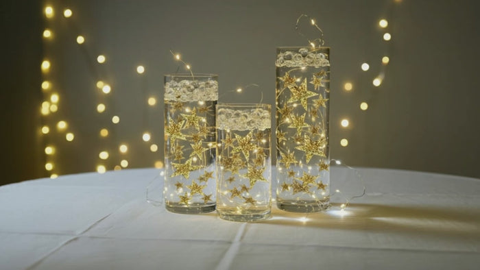 50 Floating Gold Stars- Sparkling- Large Sizes- Fills 1 Gallon of the Transparent Floating Gels for Your Vases- With Pre-Measured Prep Bags- Option of 3 Submersible Fairy Lights Strings